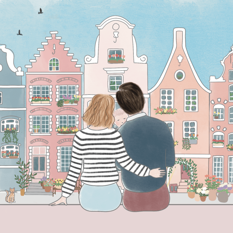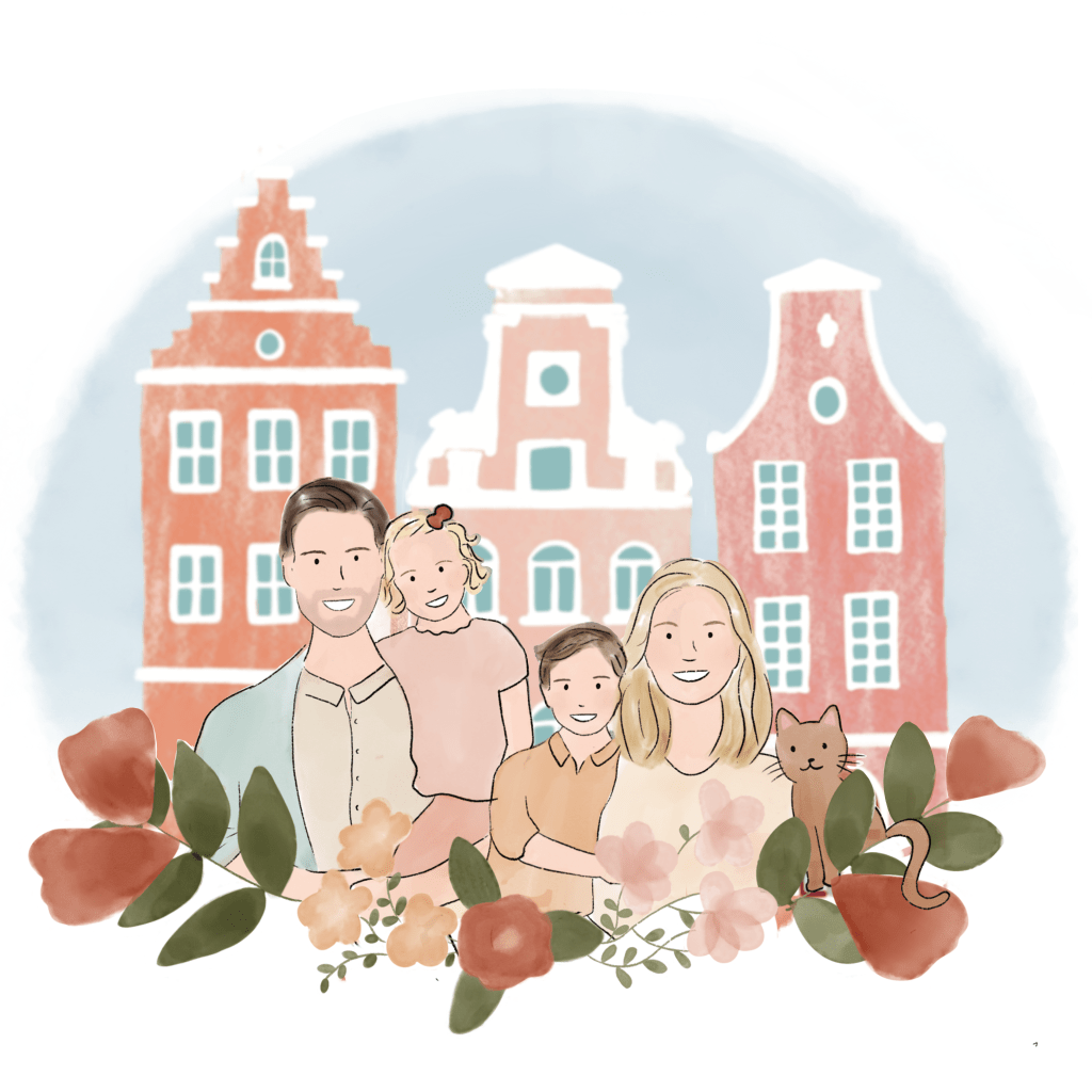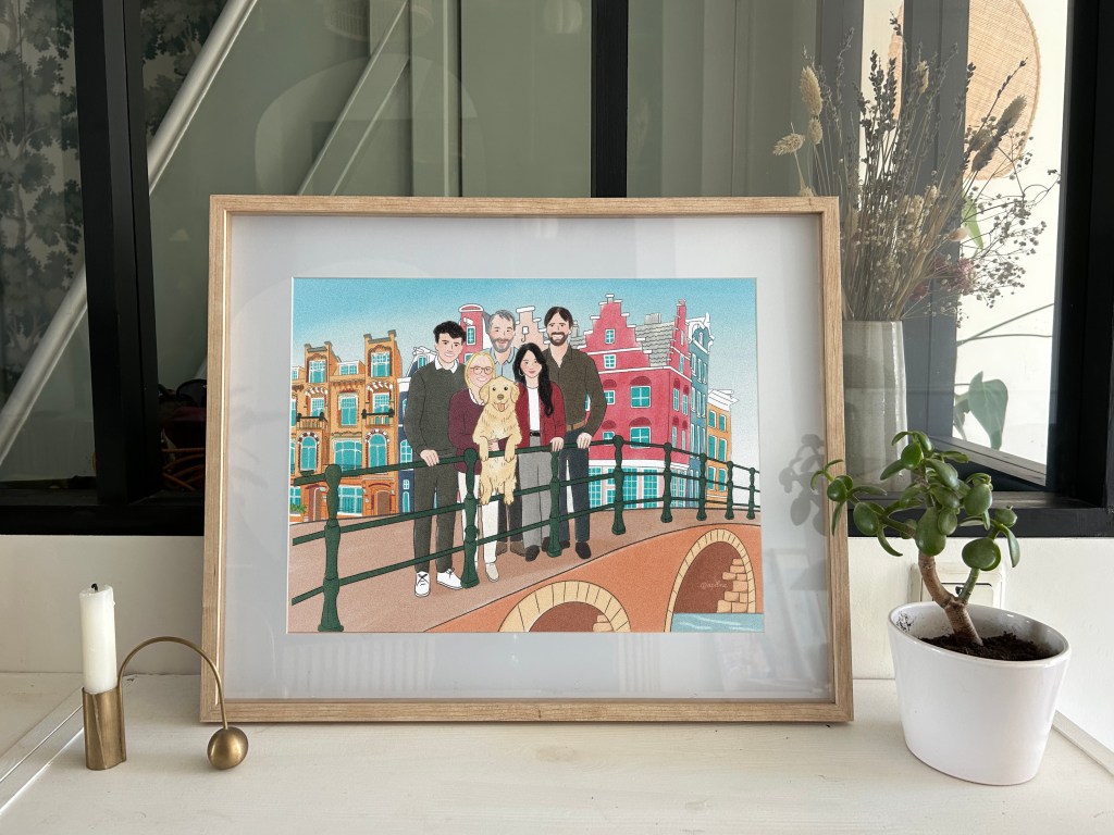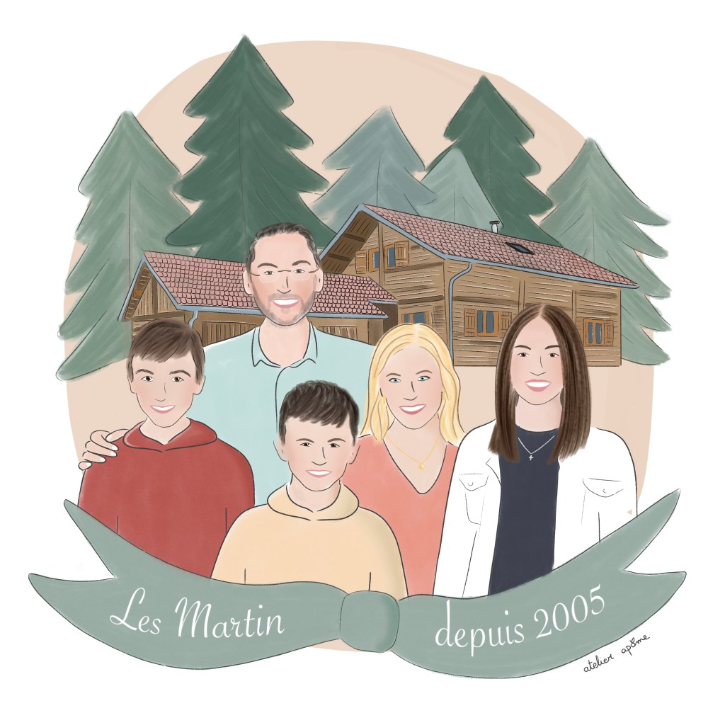 Je crée votre portrait entièrement sur mesure, j’illustre le fond de votre choix, votre endroit préféré, votre maison, un paysage, un lieu imaginaire, tout est possible !