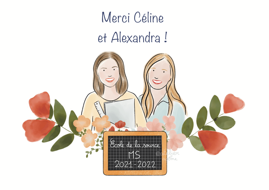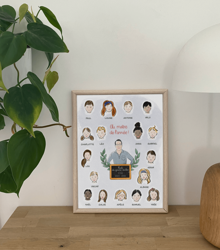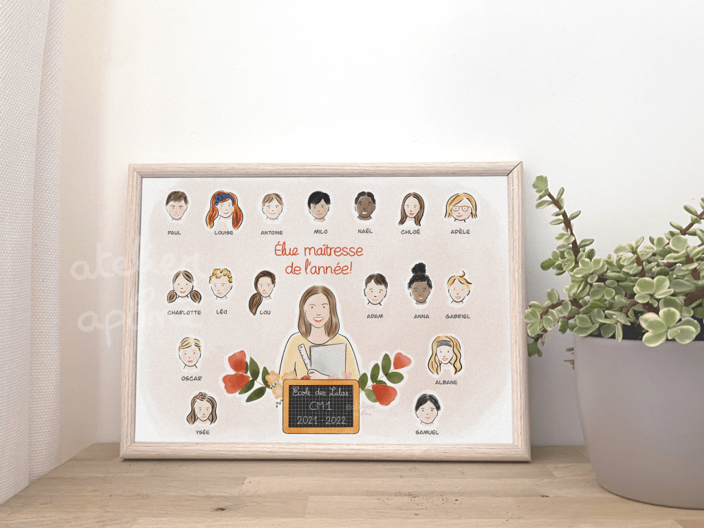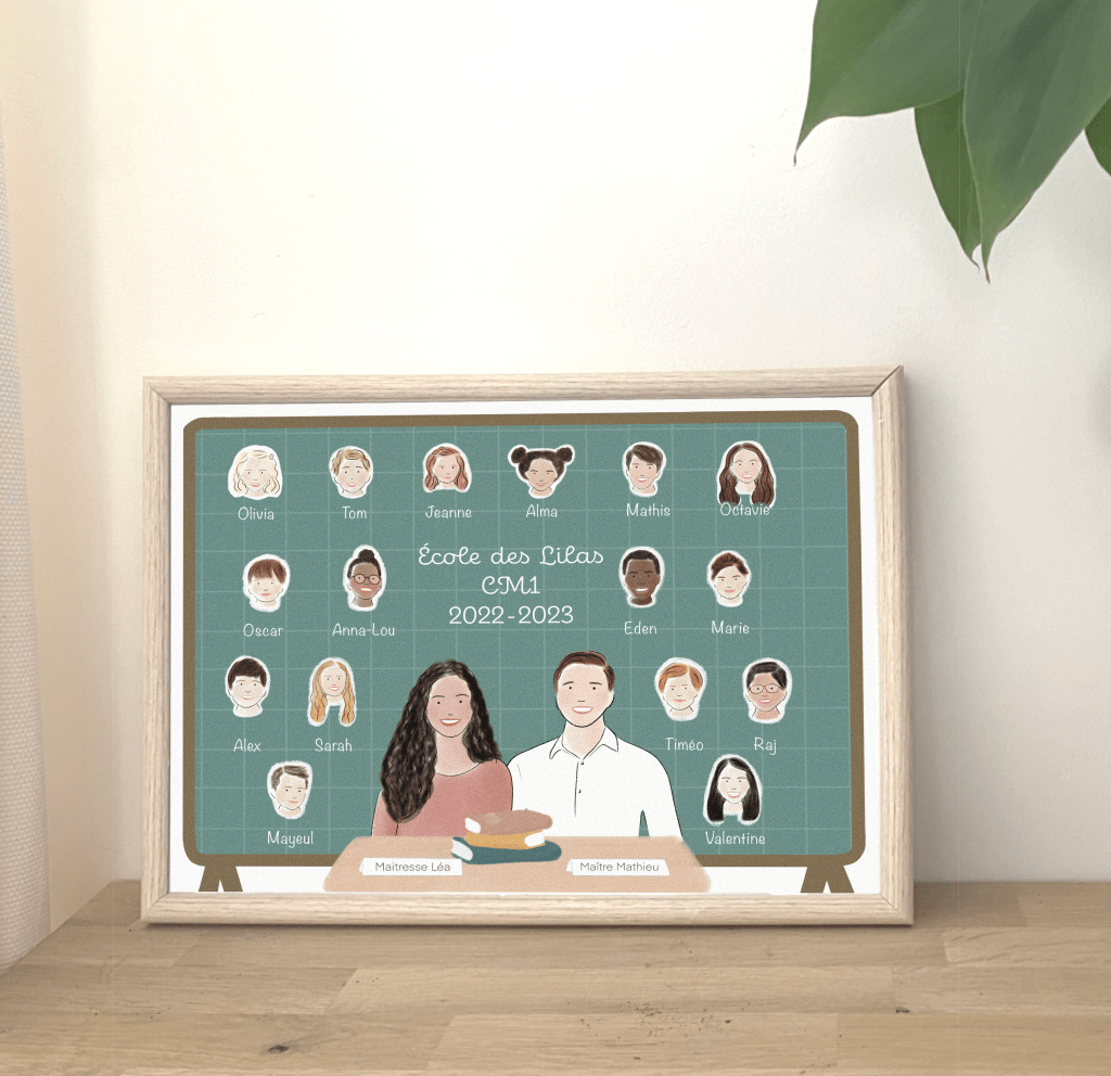 | Ce prix comprend : – Illustration personnalisée du nombre de professeurs et d’enfants commandé (photo de classe ou photos individuelles à me fournir) – Choix du texte, ajout des prénoms – Choix de la couleur de fond – Impression A4 et mise sous cadre X1 Livraison gratuite à Amsterdam Envoi postal 12€ (illustration + cadre) Copies papier supplémentaires pour les parents le souhaitant, 4,50€/copie, 10€ avec cadre. Chaque illustration vous sera également remise en version digitale haute définition. |