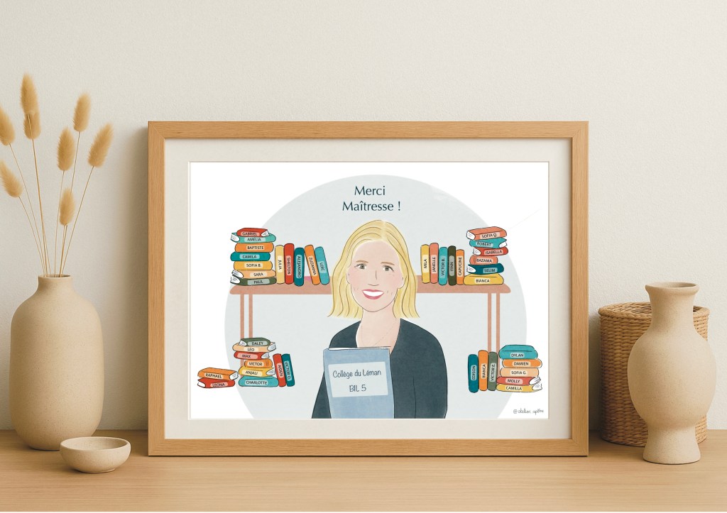 | Ce prix comprend : – Illustration personnalisée d’un professeur ou personne de votre choix – Choix du texte – Choix de la couleur de fond Livraison gratuite à Amsterdam Envoi postal 12€ (illustration + cadre) (possible aussi d’obtenir une version digitale si vous souhaitez l’imprimer chez vous). Copies papier supplémentaires pour les parents le souhaitant, 4,50€/copie avec cadre 10€ Chaque illustration vous sera également remise en version digitale haute définition. |